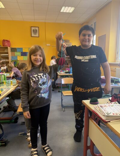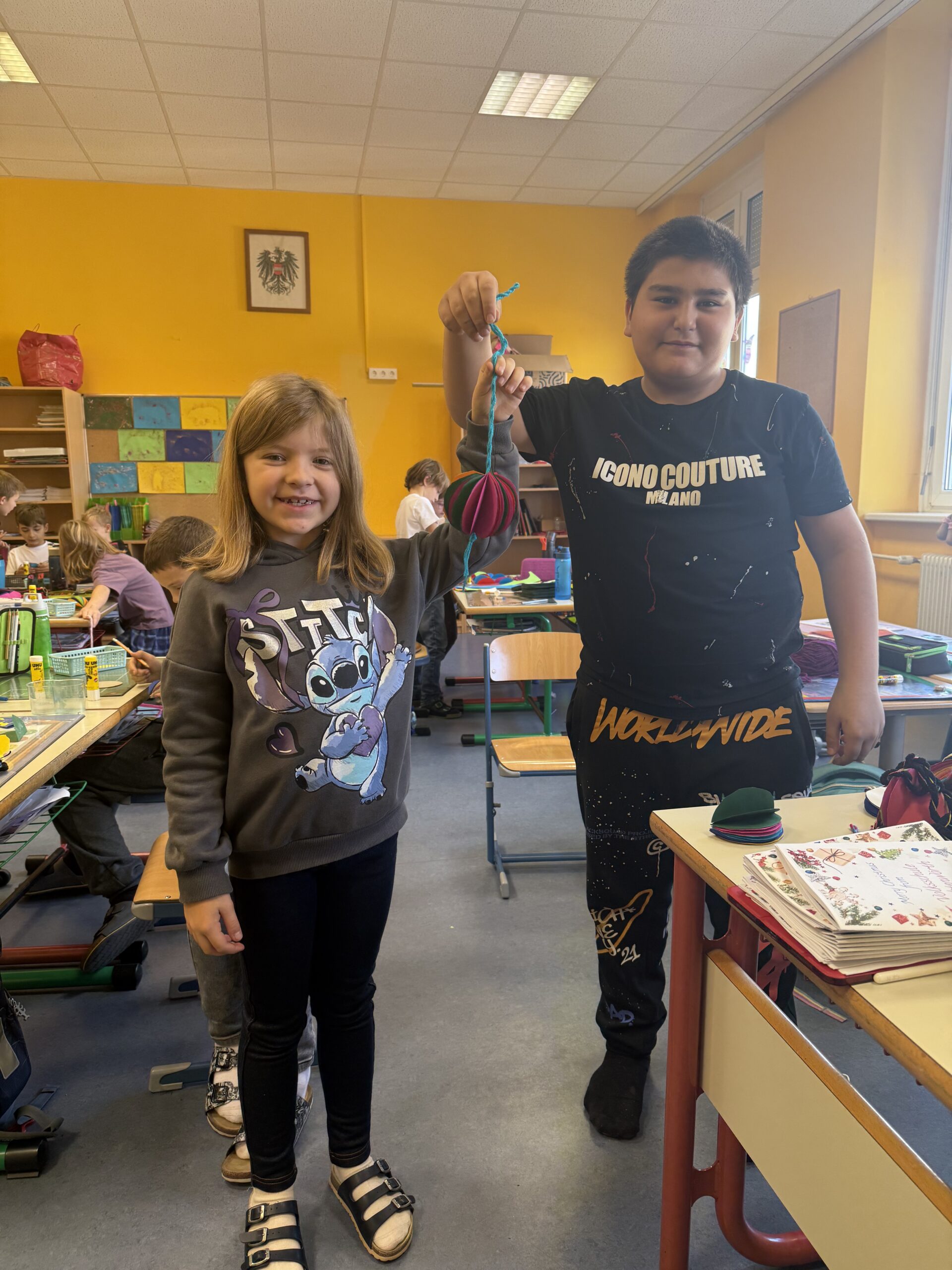 Aber, was ist das? Eine Aktion der Europäischen Union an der Schulen in ganz Europa teilnehmen. Hierbei schicken unsere 3. Klassen an 22(!) Schulen selbstgestaltete Christbaum-Dekoration und Informationen darüber, wie wir hier in Österreich Weihnachten feiern. Von den 22 Schulen aus unserer Gruppe bekommen auch wir Informationen und Christbaum-Deko zurück, mamma mia!